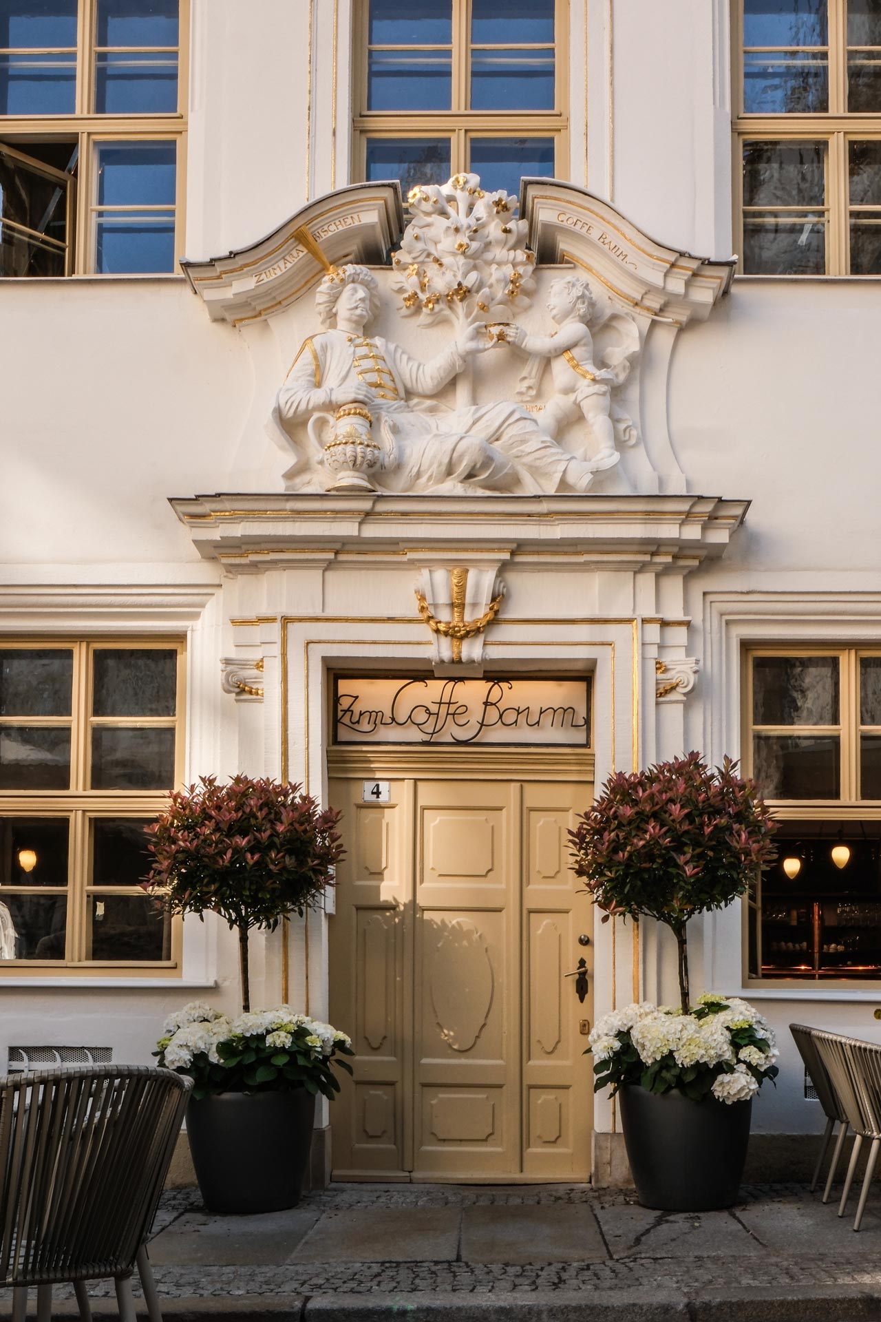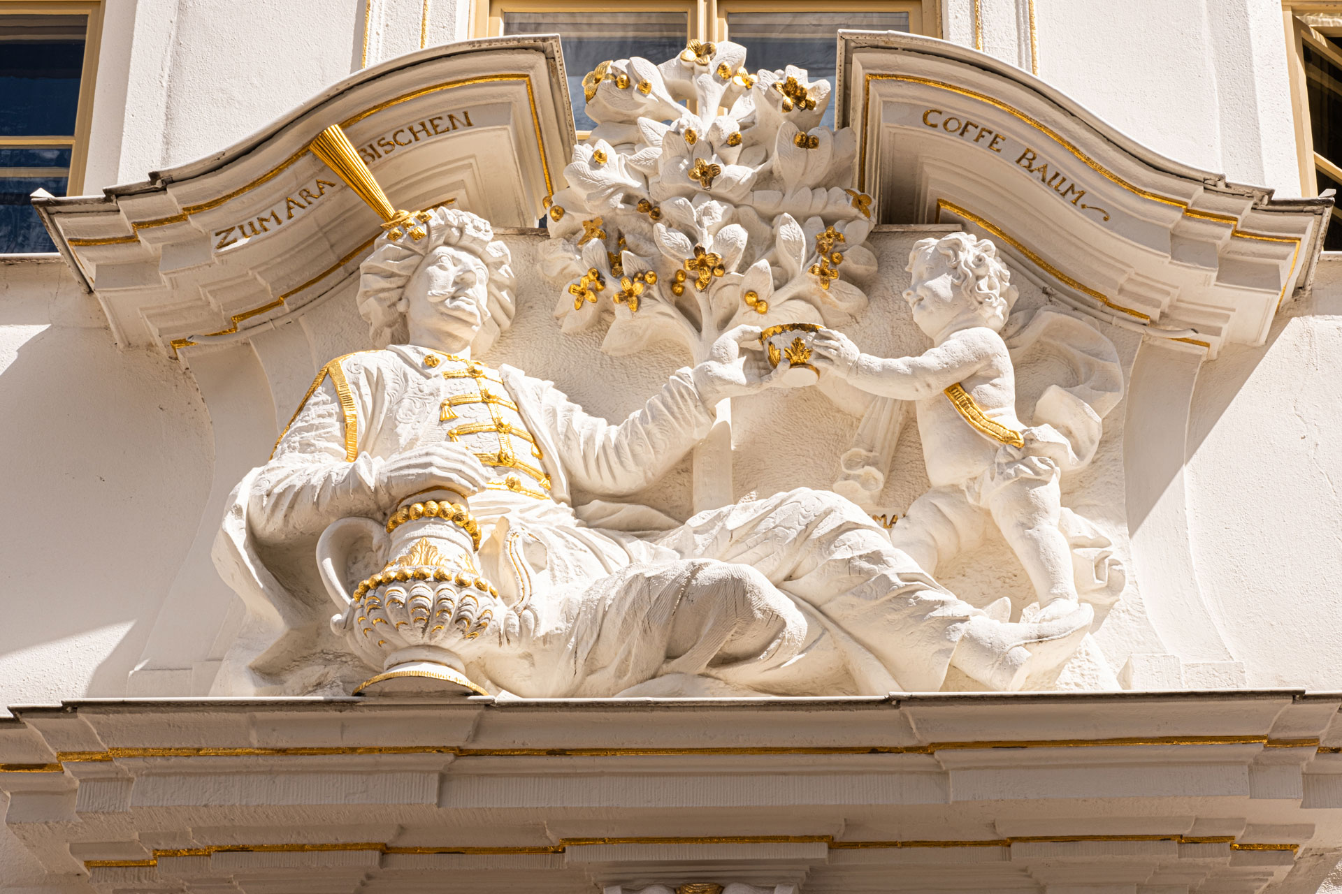 Die barocke Fassade des Gebäudes ist mit einem Relief geschmückt, das einen orientalischen Würdenträger zeigt, dem ein Putto – eine geflügelte Kindergestalt – eine Schale Kaffee reicht.